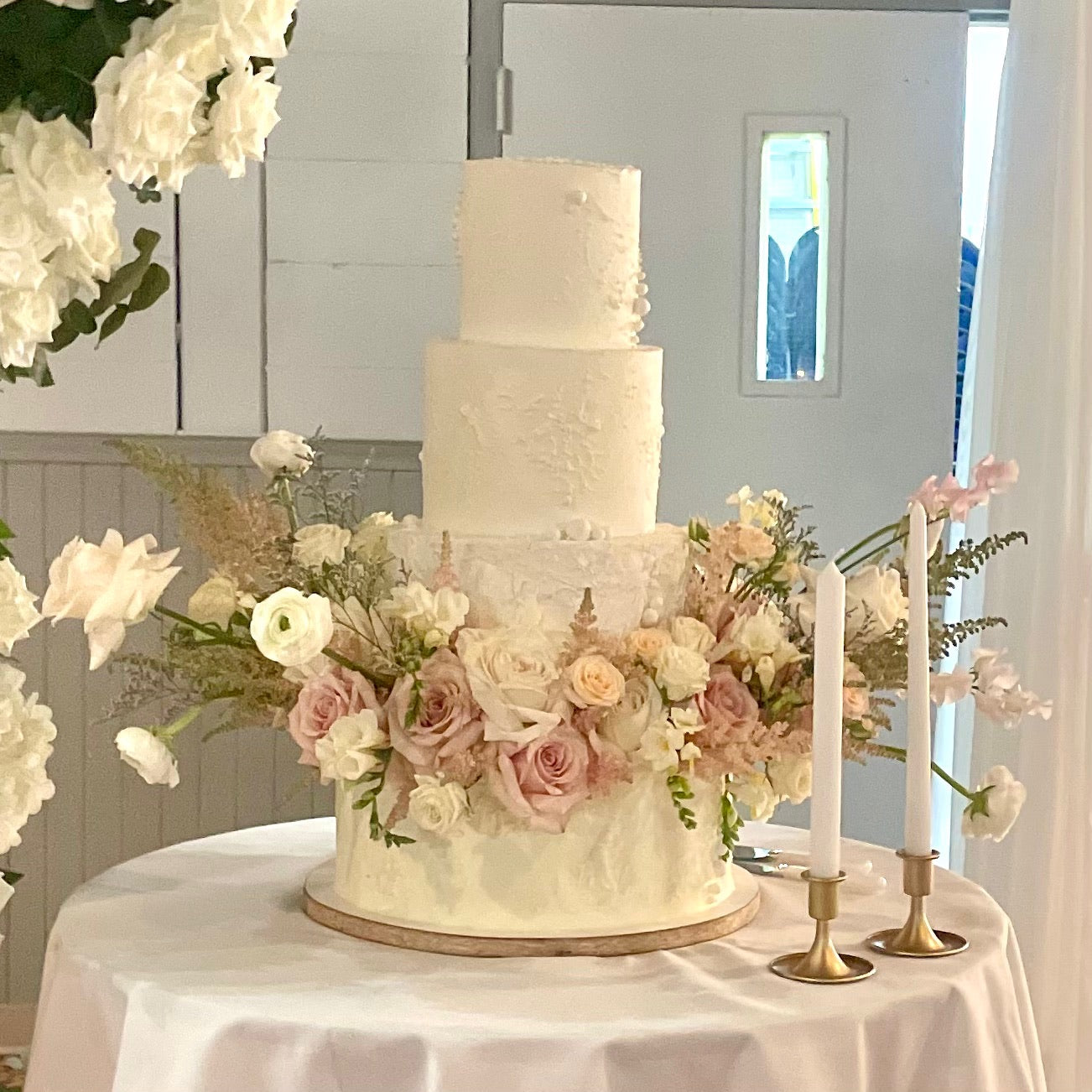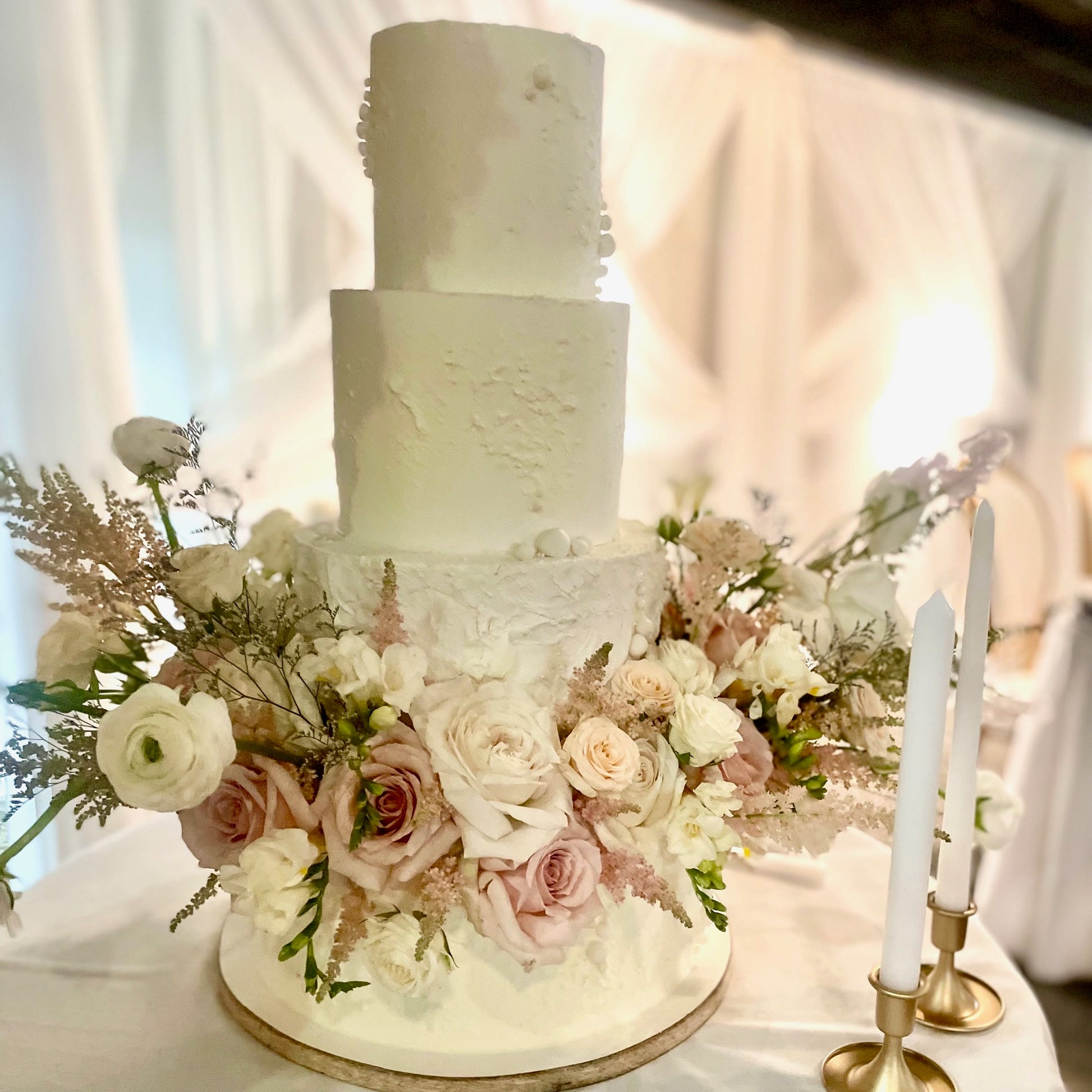 Queen City Cakes’ Bohemian Rhapsody Cake is a true celebration of free-spirited elegance and intricate artistry. This cake boasts layers of deliciously moist cake, enveloped in a smooth, artisanal ivory that provides a perfect canvas for its centerpiece. The highlight is an exquisite floral center spray, meticulously arranged with a mix of vibrant and delicate blooms. Each flower is carefully chosen for its unique beauty and arranged to create a harmonious yet whimsical display. The combination of rich colors and textures brings a bohemian charm that captures the essence of romance and individuality.